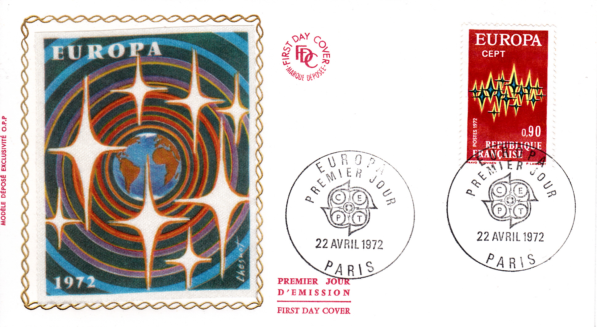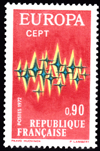 In Frankreich erschienen die Europamarken 1972 am 22. April 1972. Hier die Marke zu 0,90 Fr mit dem mit dem Gemeinschaftsmotiv "Sterne" als Einzelfrankatur auf einem Brief von Straßburg nach Ludwigshafen. Die Abstempelung erfolgte mit einem Sonderstempel beim Postamt des Europarates vom 22.4.1972 am Ersttag der Marke. Die Auflage der Marke betrug 10 500 000 Stück.