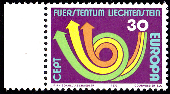In Liechtenstein erschienen die Europamarken 1973 am 8. März 1973. Hier die Marke zu 30 Rappen mit dem Gemeinschaftsmotiv "Stilisiertes Posthorn ", die in einer Auflage von 1 891 064 Stück erschien.