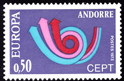 Bei der französischen Post in Andorra erschienen die Europamarken 1973 am 28. April 1973. Hier die Marke zu 0,50 Franc im Gemeinschaftsmotiv "Stilisiertes Posthorn". Die Auflage betrug 800 000 Stück.