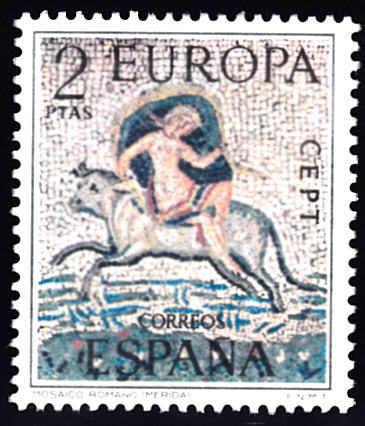 In Spanien erschienen die Europamarken 1973 am 30. April 1973. Hier die Marke zu 2 Ptas, die nicht im Gemeinschaftsmotiv erschien. Die Marke zeigt "Europa und der Stier", ein Mosaik aus dem Mérida-Museum, als Motiv. Die Auflage betrug 20 000 000 Stück.