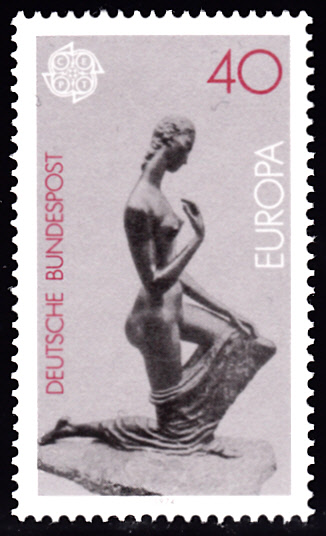 Bei der Deutschen Bundespost erschienen die Europamarken 1974 am 17. April 1974. Hier die Marke zu 40 Pfennig zu dem Gemeinschafts Thema "Skulpturen", die in einer Auflage von 68 200 000 Stück erschien. Die Marke zeigt die Skulptur "Knieende" von Wilhelm Lehmbruck (1881-1919).