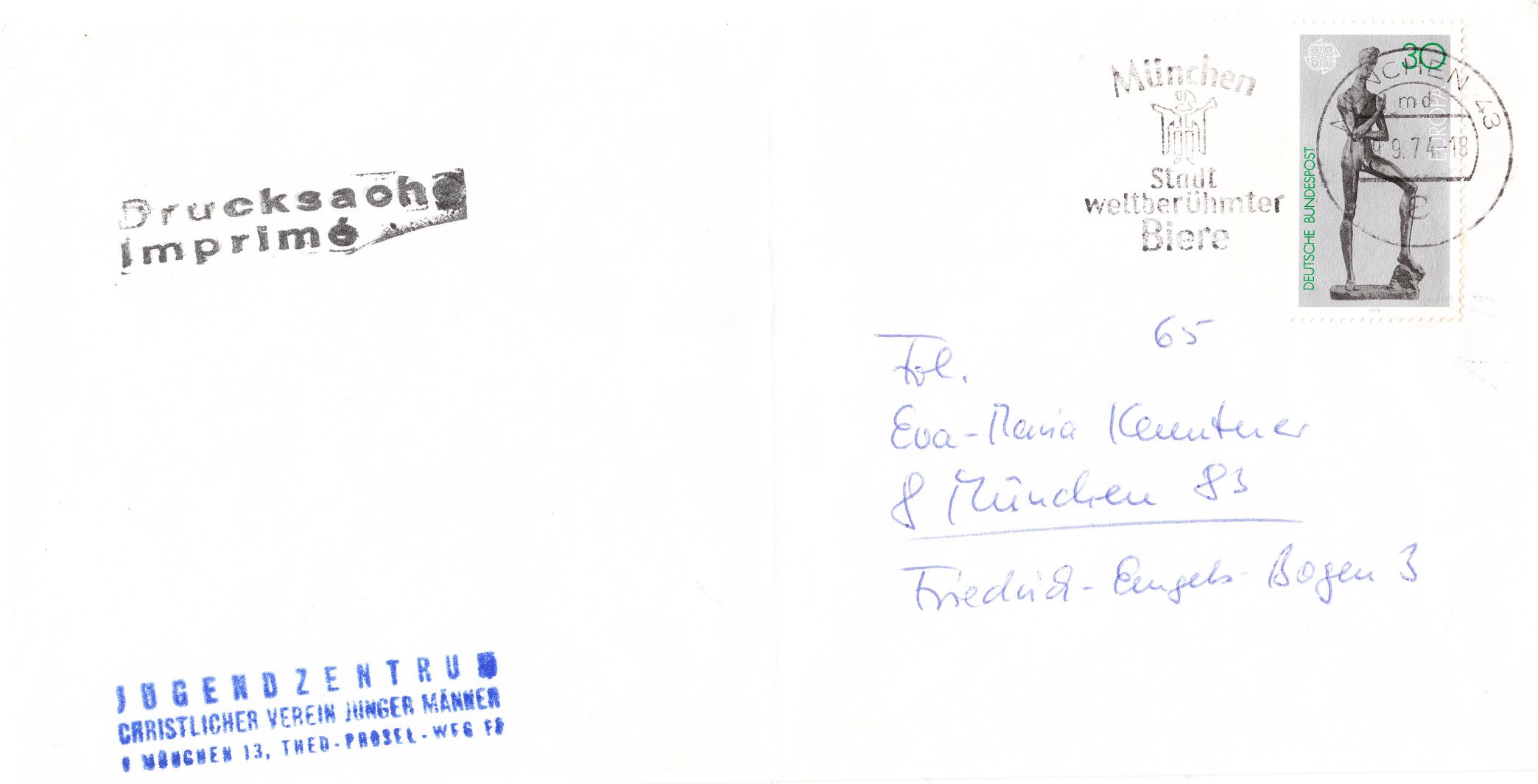 EF der Europamarke 1974 der Wertstufe zu 30 Pfennig, hier ein Exemplar vom Oberrand, am 02.09.1974 portogerecht auf Drucksache: