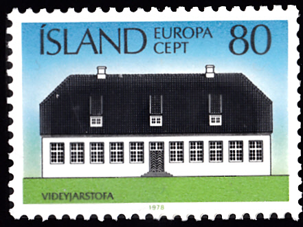 In Island erschienen am 15. Mai 1978 die Europamarken 1978 zum Gemeinschaftsthema "Baudenkmäler". Hier die Marke zu 80 Kronen mit dem Videyjarstofa (1752-54), dem ersten isländischen Steinhaus. Die Auflage betrug 1 500 000 Stück.