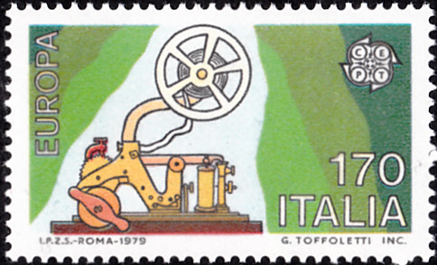 In Italien erschienen die Europamarken 1979 zum Gemeinschaftsthema "Geschichte des Post- und Fernmeldewesens" am 30. April 1979. Hier die Marke zu 170 Lire mit der Abbildung eines Morseapparates. Die Auflage betrug 10 000 000 Stück.