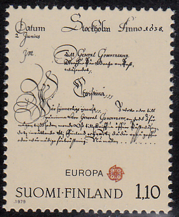 In Finnland erschienen die Europamarken 1979 zum Gemeinschaftsthema "Geschichte des Post- und Fernmeldewesens" am 2. Mai 1979. Hier die Marke zu 1,10 M mit der Abbildung eines Briefes der Königin Christina an Generalgouverneur Pietari (Per) Brahe (1638). Die Auflage betrug 5 000 000 Stück.