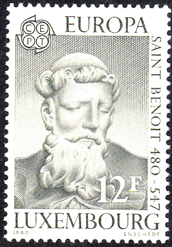 In Luxemburg erschienen die Europamarken 1980 zum Gemeinschaftsthema "Bedeutende Persönlichkeiten" am 28. April 1980. Hier die Marke zu 12 Fr schwarzoliv mit einem Porträt des Hl. Benedikt von Nursia (480-547, Ordensgründer). Die Auflage betrug 800 000 Stück.