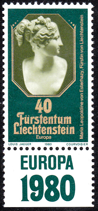 In Liechtenstein erschienen die Europamarken 1980 zum Gemeinschaftsthema "Bedeutende Persönlichkeiten" am 10. März 1980. Hier die Marke zu 40 Rappen mit Marie Leopoldine Esterházy von Galánthá (1788-1846), Fürstin von Liechtenstein, Büste von Antonio Canova (1757-1822) ). Die Auflage betrug 2 287 721 Stück.
