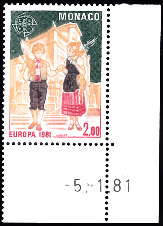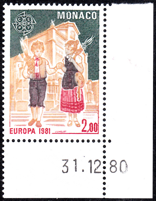 In Monaco erschienen die Europamarken 1981 zum Gemeinschaftsthema "Folklore" am 4. Mai 1981. Hier die Marke zu 2,00 Fr mit dem Motiv "Kinder bei Palmweihe am Palmsonntag" als Eckrandstück mit Druckdatum. Die Auflage betrug 362 076 Stück.