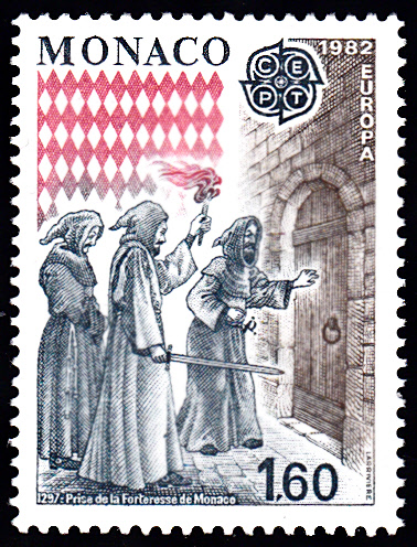 In Monaco erschienen die Europamarken 1982 zum Gemeinschaftsthema "Historische Ereignisse" am 3. Mai 1982. Hier die Marke zu 1,60 Fr mit der Darstellung der Eroberung der Festung von Monaco durch die Grimaldi, verkleidet als Franziskanermönche (1297). Die Auflage betrug 301 601 Stück.