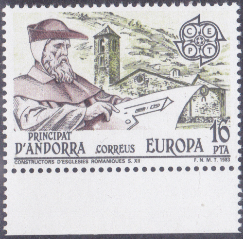 Bei der spanischen Post in Andorra erschienen die Europamarken 1983 zum Gemeinschaftsthema "Große Werke des menschlichen Geistes" am 7. Juni 1983. Hier die Marke zu 16 Peseten mit der Kirche von La Cortinada aus dem 12. Jahrhundert und einem Architekt mit Plan . Die Marke erschien in einer Auflage von 1 100 000 Stück.