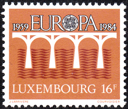 In Luxemburg erschienen die Europamarken 1984 anlässlich dem Jubiläum "25 Jahre Europäische Konferenz der Verwaltungen für das Post- und Fernmeldewesen (CEPT)" im einheitlichen Motiv "Brücke" am 7. Mai 1984 in einer Auflage von 600 000 Sätzen. Hier die Marke zu 16 Fr: