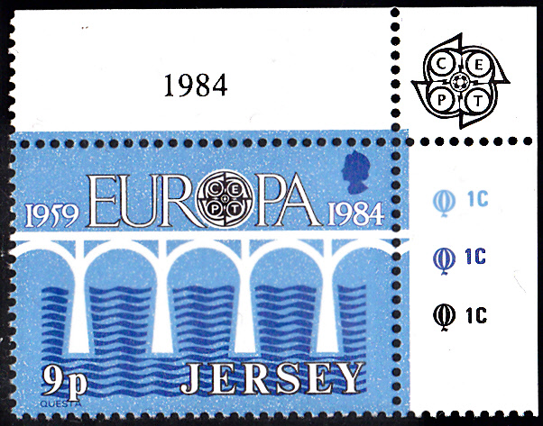 Auf Jersey erschienen die Europamarken 1984 anlässlich dem Jubiläum "25 Jahre Europäische Konferenz der Verwaltungen für das Post- und Fernmeldewesen (CEPT)" im einheitlichen Motiv "Brücke" am 12. März 1984. Hier Eckrandstück mit Plattennummer der Marke zu 9 Pence, die in einer Auflage von 1 352 245 Stück erschien.