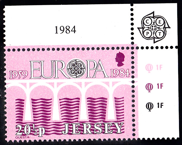Auf Jersey erschienen die Europamarken 1984 anlässlich dem Jubiläum "25 Jahre Europäische Konferenz der Verwaltungen für das Post- und Fernmeldewesen (CEPT)" im einheitlichen Motiv "Brücke" am 12. März 1984. Hier Eckrandstück mit Plattennummer der Marke zu 20 1/2 Pence, die in einer Auflage von 742 046 Stück erschien.