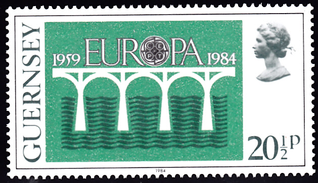 In Großbritannien-Guernsey erschienen die Europamarken 1984 anlässlich dem Jubiläum "25 Jahre Europäische Konferenz der Verwaltungen für das Post- und Fernmeldewesen (CEPT)" im einheitlichen Motiv "Brücke" am 10. April 1984. Hier die Marke zu 20 1/2 Pence, die in einer Auflage von 903 972 Stück erschien.