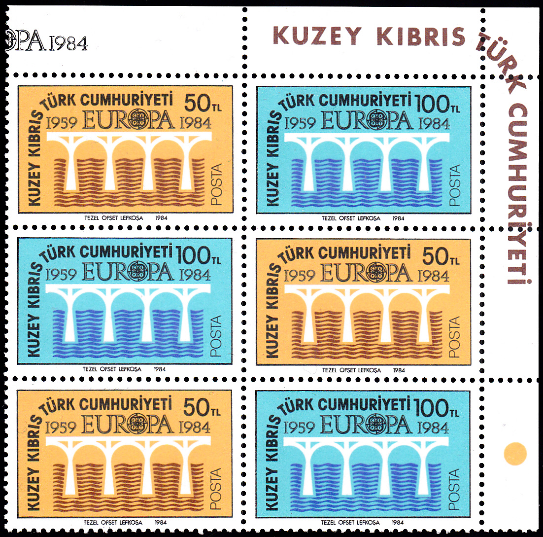 In Türkisch-Zypern erschienen die beiden Europamarken 1984 zu 50 TL und 100 TL mit dem Gemeinschaftsmotiv "Brücke" schachbrettartig zusammenhängend gedruckt in einer Auflage von 350 000 Sätzen. Hier ein Bogenteil vom rechten oberen Bogenrand mit drei Zusammendrucken.