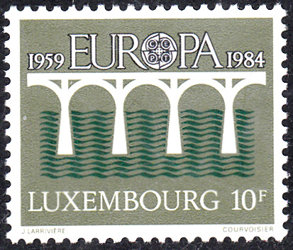 In Luxemburg erschienen die Europamarken 1984 anlässlich dem Jubiläum "25 Jahre Europäische Konferenz der Verwaltungen für das Post- und Fernmeldewesen (CEPT)" im einheitlichen Motiv "Brücke" am 7. Mai 1984 in einer Auflage von 600 000 Sätzen. Hier die Marke zu 10 Fr: