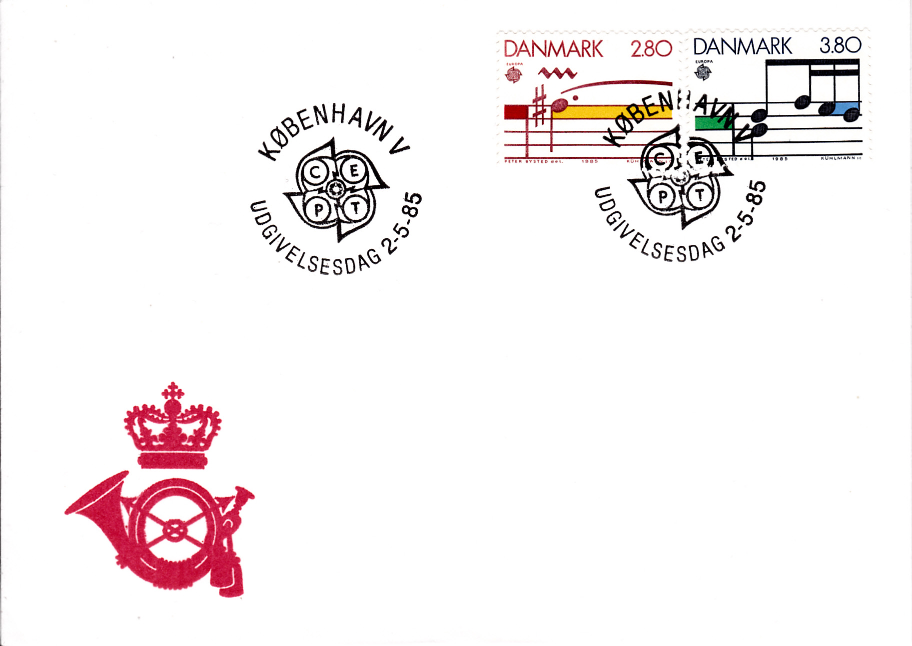 In Dänemark erschienen die Europamarken 1985 zum Gemeinschaftsthema "Europäisches Jahr der Musik" am 2. Mai 1985. Hier die Marke zu 2,80 Kronen mit einem Ausschnitt aus einem Notenblatt. Die Marke hat eine Auflage von 8 500 000 Stück.