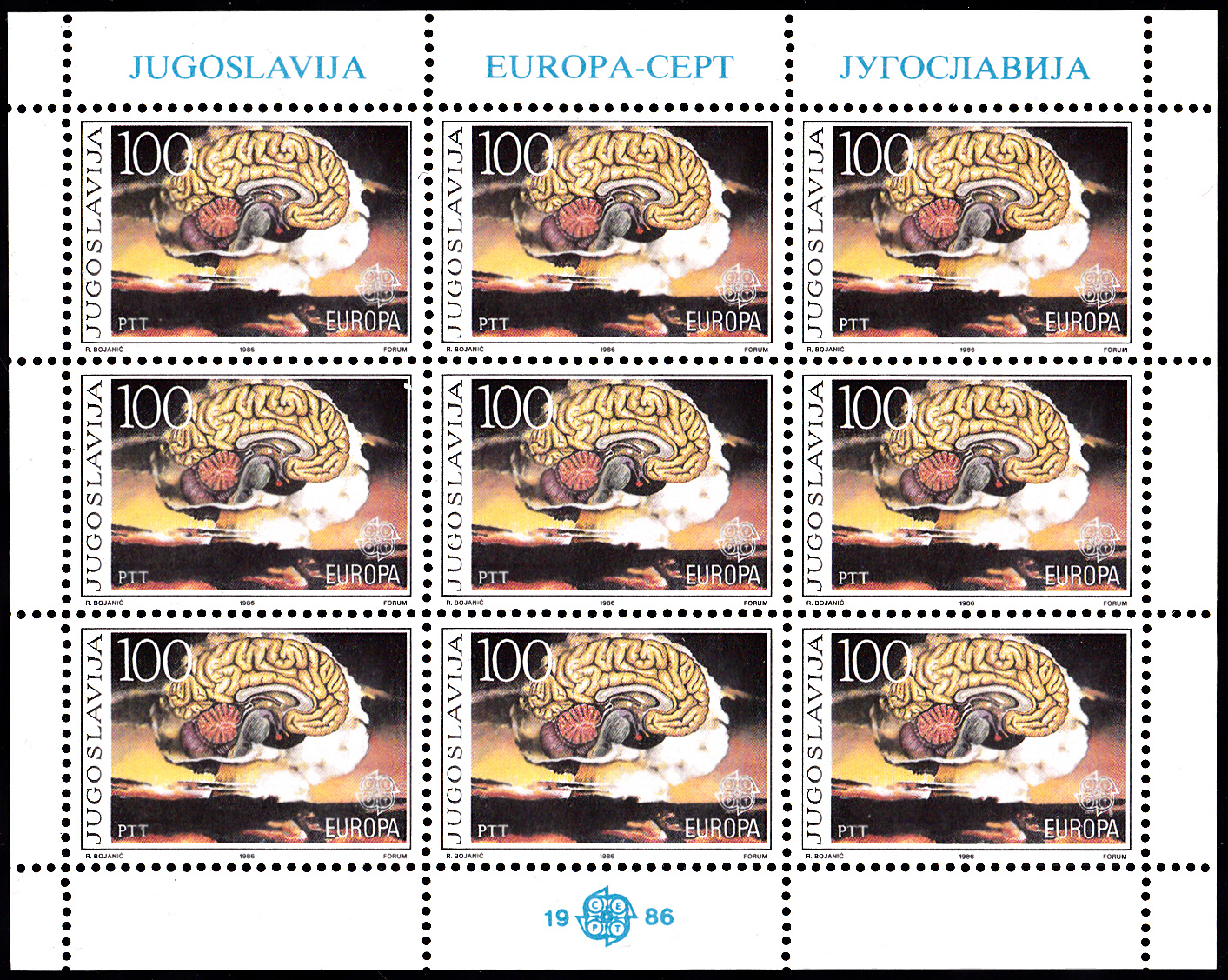 In Jugoslawien erschienen die Europamarken 1986 am 28. April 1986 zum Gemeinschaftsthema "Natur- und Umweltschutz". Hier die Marke zu 100 Dinar mit der Abbildung "Menschliches Gehirn und Atompilz ", die in einer Auflage von 400 000 Stück erschien.