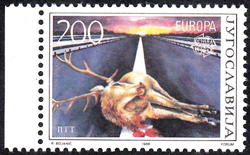In Jugoslawien erschienen die Europamarken 1986 am 28. April 1986 zum Gemeinschaftsthema "Natur- und Umweltschutz". Hier die Marke zu 200 Dinar mit der Abbildung "Angefahrener Hirsch auf Autostraße", die in einer Auflage von 400 000 Stück erschien.