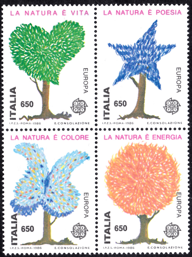 In Italien sind die Europamarken 1986 zum Gemeinschaftsthema "Natur- und Umweltschutz" am 28. April 1986 erschienen. Hier eine Marke zu 650 Lire mit der Abbildung eines Baumes mit sonnenförmiger Krone. Die Auflage betrug 5 000 000 Stück.