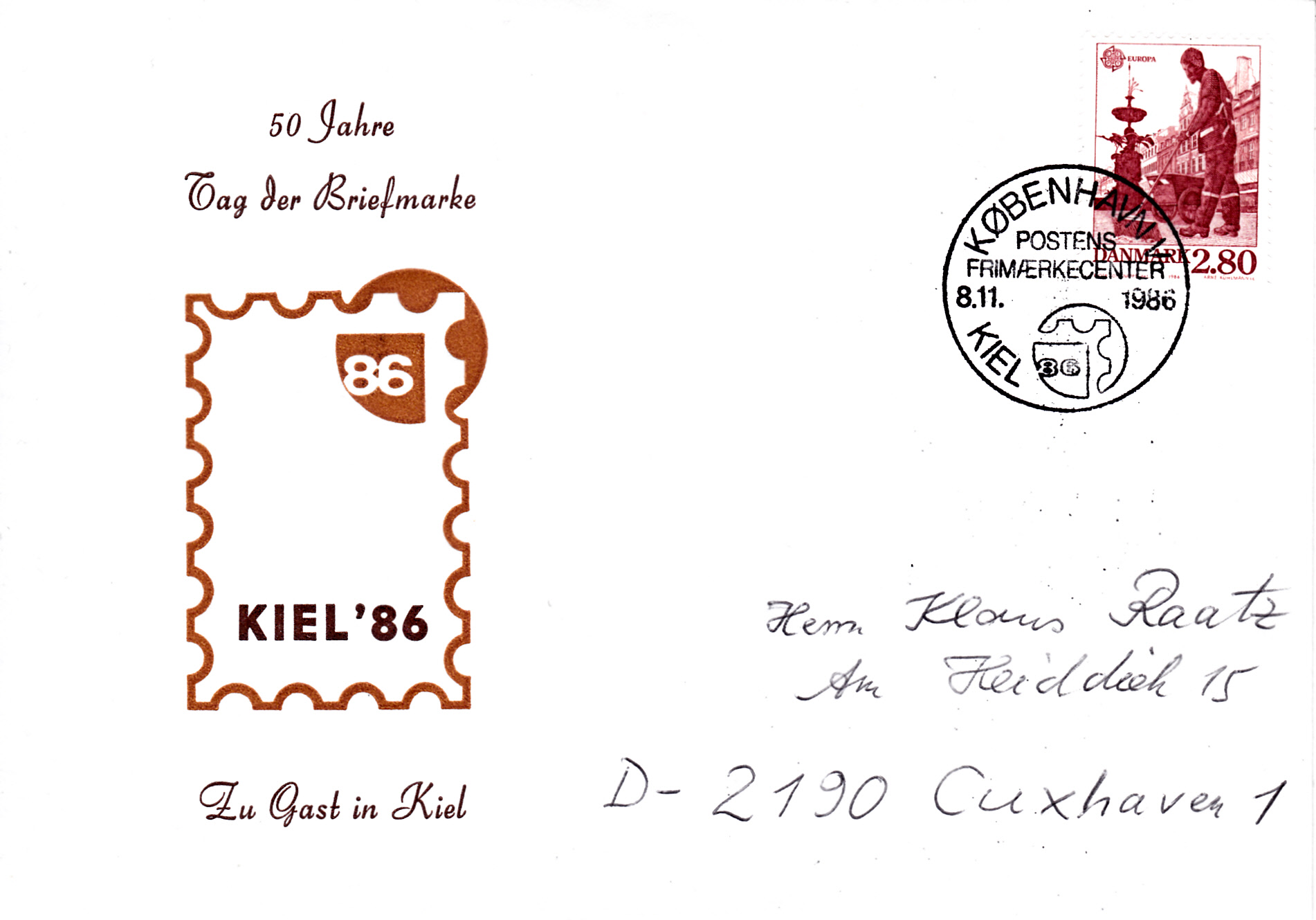 Auf diesem Brief nach Cuxhaven wurde die Europamarke zu 2,80 Kr mit einem Sonderstempel aus Kopenhagen zur Teilnahme der Dänischen Post bei der Briefmarken-Ausstellung Kiel '86 entwertet.