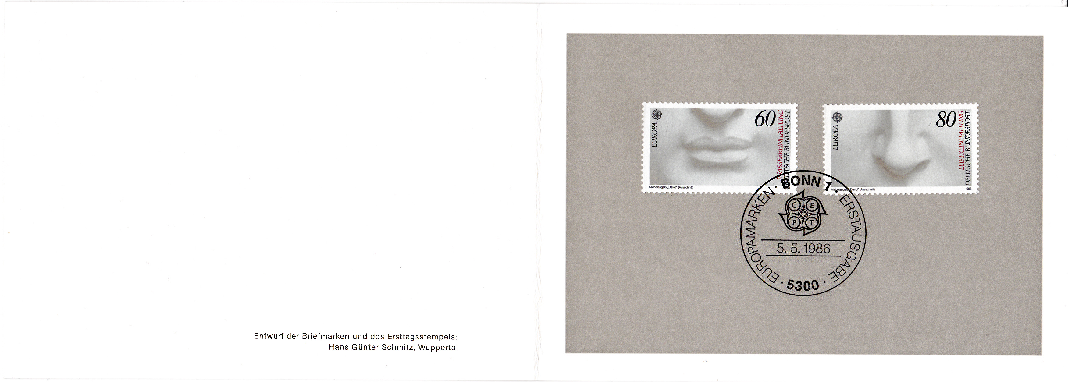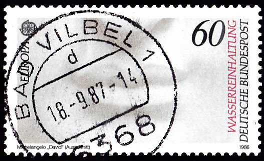 Bei der Deutschen Bundespost sind die Europamarken 1986 zum Gemeinschaftsthema "Natur- und Umweltschutz" am 5.5.1986 erschienen. Hier die Marke zu 60 Pf mit der Abbildung eines Detail von "David", einer Skulptur von Michelangelo (1475-1564, italienischer Bildhauer, Maler, Baumeister und Architekt). Die Auflage betrug 63 550 000 Stück.