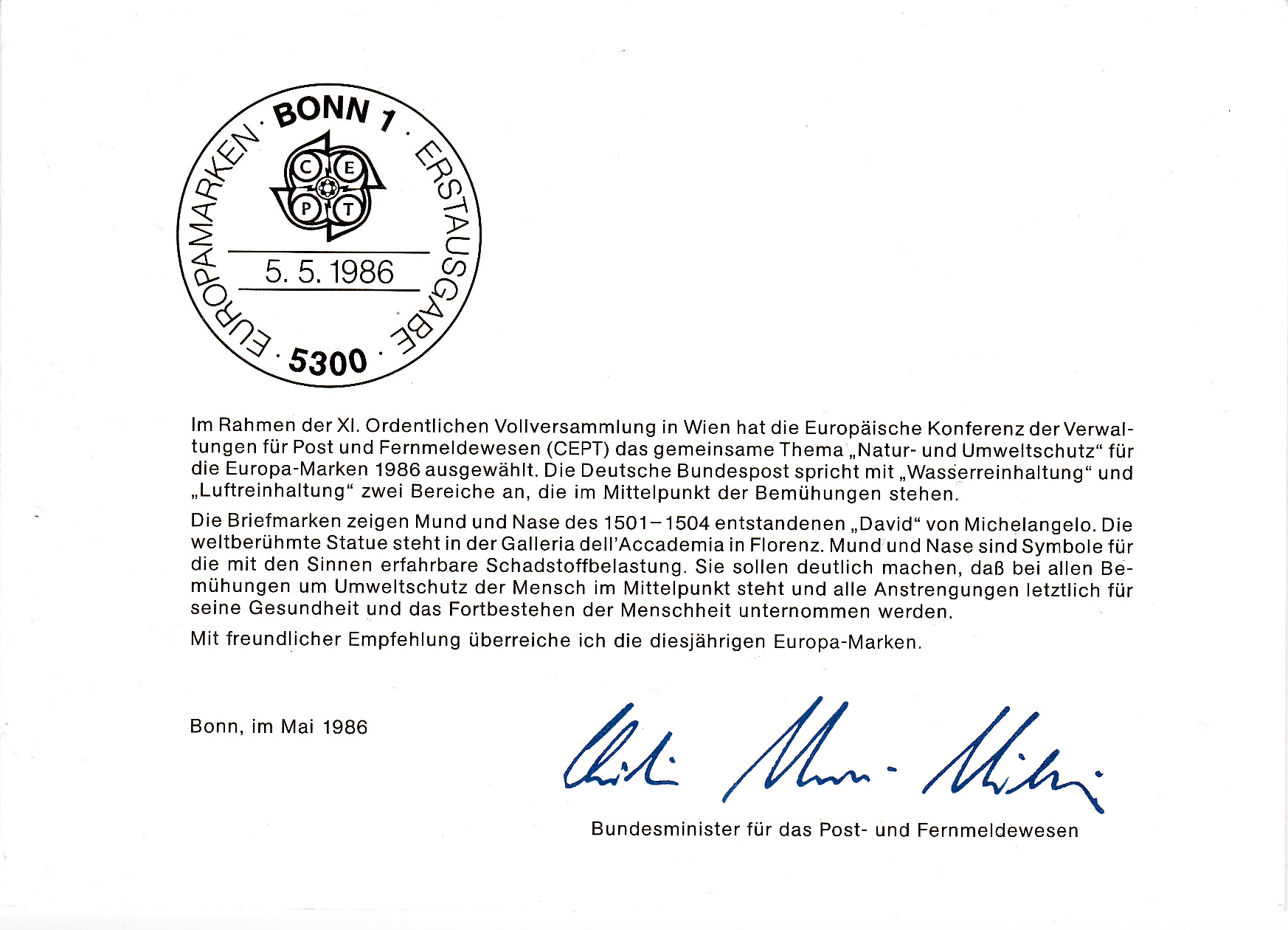 Hier eine Ministerklappkarte mit den beiden Europamarken 1986: