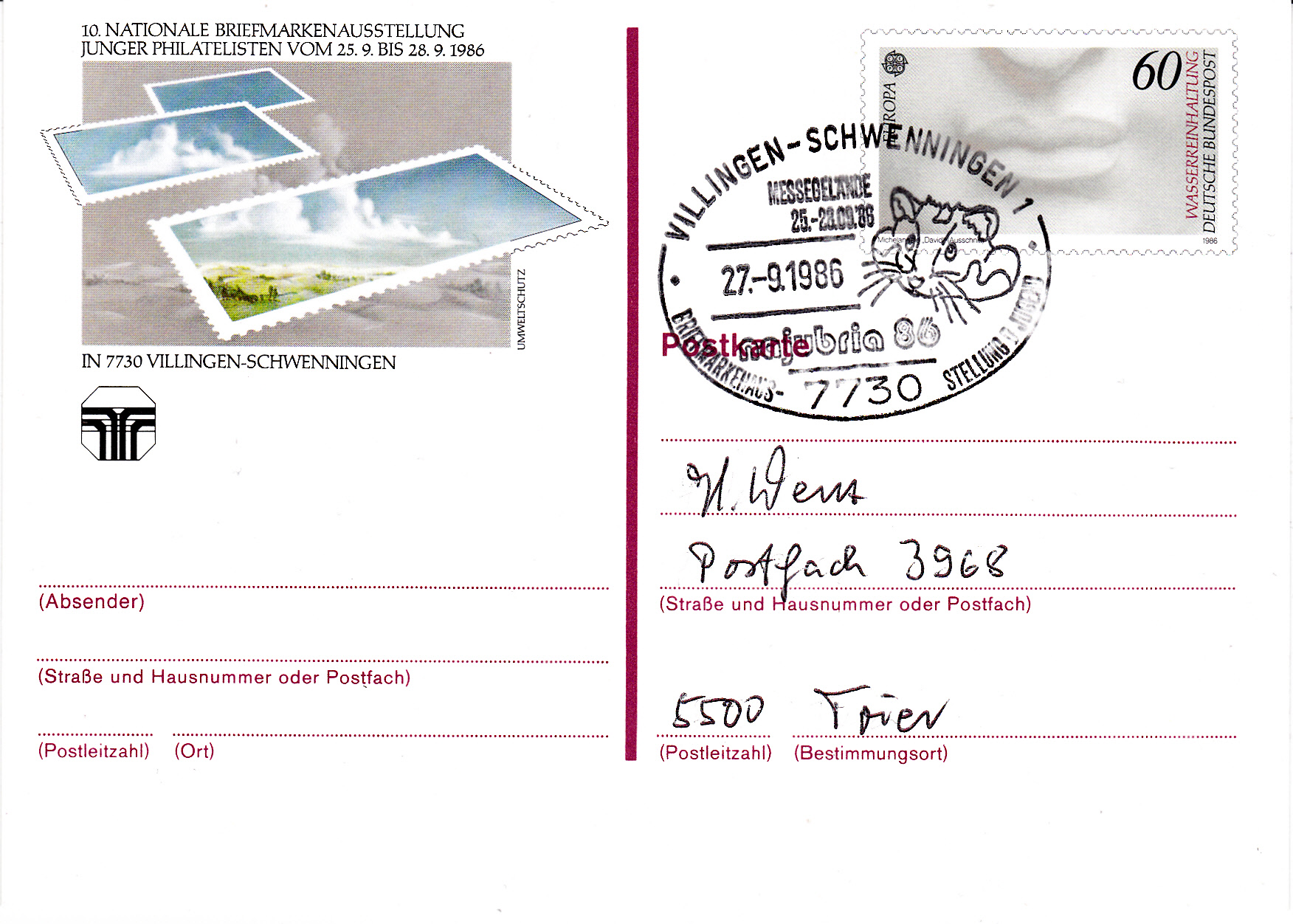 Zur NAJUBRIA '86 in Villingen-Schwenningen erschien diese Sonderpostkarte mit dem Wertzeicheneindruck der 60Pf Europamarke 1986 (MiNr PSo 13).