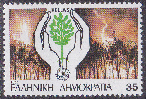 In Griechenland erschienen die Europamarken 1986 am 10. April 1986 zum Gemeinschaftsthema "Natur- und Umweltschutz". Hier eine Marke zu 35 Drachmen mit der Abbildung "Waldbrand" und Hände mit jungem Trieb. hier zeige ich eine nur senkrecht gezähnte Marke aus einem Markenheftchen (MiNr 1630 C). Die Auflage dieser Markenvariante aus dem Markenheftchen (MiNr MH 5) beträgt 200 000 Stück.