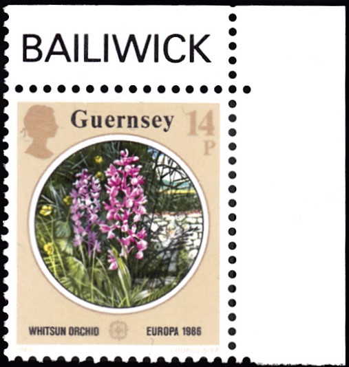 In Großbritannien-Guernsey erschienen die Europamarken 1986 am 22. Mai 1986 zum Gemeinschaftsthema "Natur- und Umweltschutz". Hier die Marke zu 14 Pence mit einer Lockerblütigen Orchidee (Orchis laxiflora) als Eckrandstück. Die Auflage dieser Marke betrug 995 123 Stück.