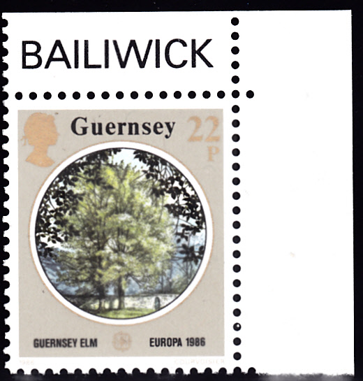 In Großbritannien-Guernsey erschienen die Europamarken 1986 am 22. Mai 1986 zum Gemeinschaftsthema "Natur- und Umweltschutz". Hier die Marke zu 22 Pence mit einer Guernsey-Ulme (Ulmus sarniensis) als Eckrandstück. Die Auflage dieser Marke betrug 662 565 Stück.