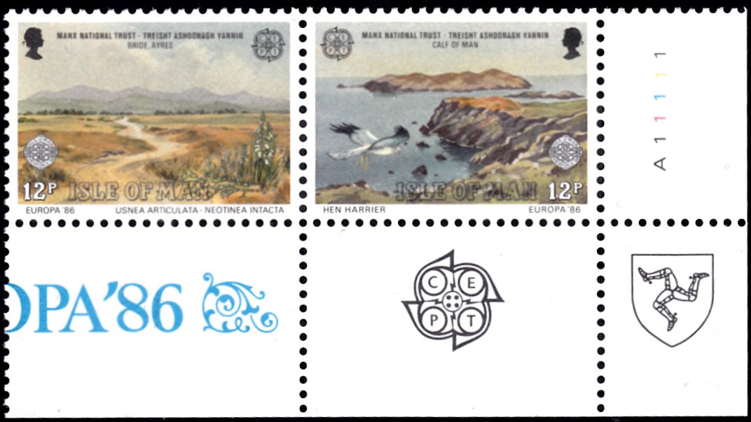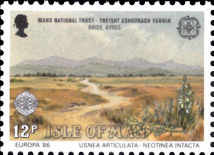 In Großbritannien-Isle of Man erschienen die Europamarken 1986 am 10. April 1986 zum Gemeinschaftsthema "Natur- und Umweltschutz". Eine Marke zu 12 Pence zeigt eine Landschaft (bei Bride, Ayres) mit Bartflechten (Usnea articulata) und einer Orchidee (Neotinea intacta).