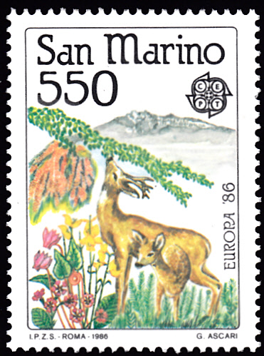 In San Marino sind die Europamarken 1986 zum Gemeinschaftsthema "Natur- und Umweltschutz" am 22. Mai 1986 erschienen. Hier eine Marke zu 550 Lire mit der Abbildung mit Damwild und Pflanzen. Die Auflage betrug 385 723 Stück.