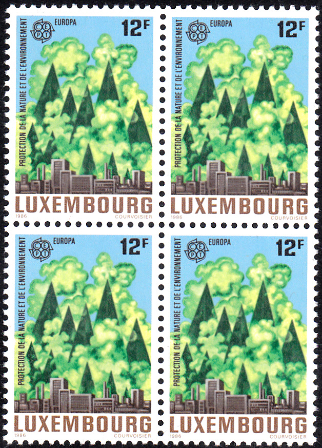 In Luxemburg erschienen die Europamarken 1986 zum Gemeinschaftsthema "Natur- und Umweltschutz" am 5. Mai 1986 in einer Auflage von 1 000 000 Sätzen. Hier ein Viererblock der Marke zu 12 Fr mit der Darstellung "Wald und Stadt".