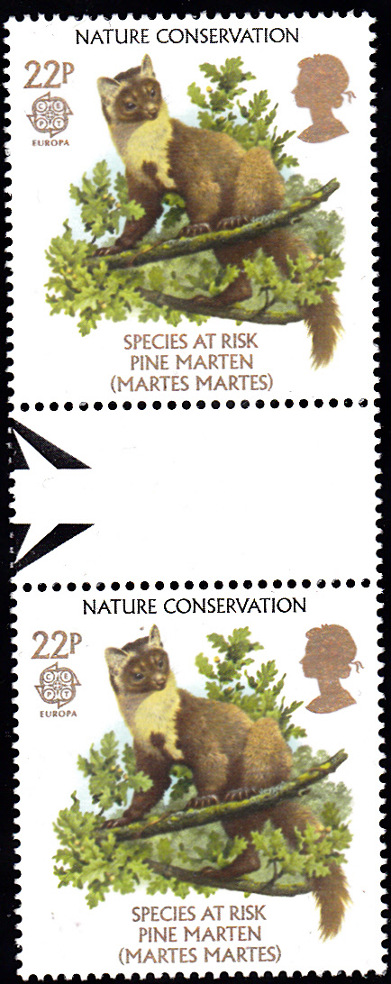 In Großbritannien erschienen die Europamarken 1986 am 20. Mai 1986 zum Gemeinschaftsthema "Natur- und Umweltschutz". Hier die Marke zu 22 Pence mit einem Baummarder (Martes martes) als Zwischenstegpaar. Die Auflage dieser Marke beträgt 7 135 800 Stück.