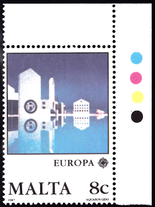 In Malta erschienen die Europamarken 1987 zum Gemeinschaftsthema "Moderne Architektur" am 15. April 1987. Hier die Marke zu 8 Cent mit dem Touristenzentrum in Aquasun. Ich zeige eine Marke vom rechten oberen Bogenrand.