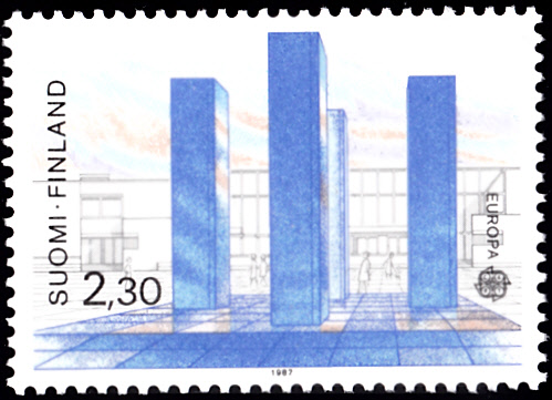 In Finnland erschienen die Europamarken 1987 zum Gemeinschaftsthema "Moderne Architektur" am 15. Mai 1987. Hier die Marke zu 2,30 Mark mit dem Monument "Stoa" in Helsinki-Itäkeskus von Hannu Sirén (geb. 1953, Bildhauer). Die Marke hatte eine Auflage von 4 000 000 Stück.