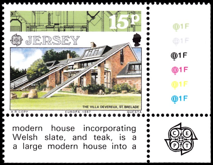 In Großbritannien-Jersey erschienen die Europamarken 1987 zum Gemeinschaftsthema "Moderne Architektur" am 23. April 1987. Hier die Marke zu 15 Pence mit der Villa Devereux in St. Brelade. Die Auflage dieser Marke betrug 883 825 Stück. Hier zeige ich ein Eckrandstück mit Plattennummer.