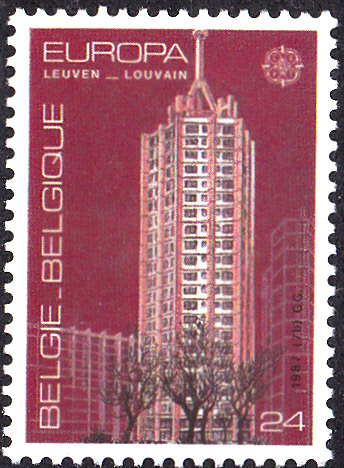 In Belgien erschienen die Europamarken 1987 zum Gemeinschaftsthema "Moderne Architektur" am 9. Mai 1987. Hier die Marke zu 24 Francs mit dem St.-Maartensdal-Turm in Löwen von Renaat Braem (1910-2001), Jan De Mol (1921-2004) und Albert Moerkerke . Die Marke hatte eine Auflage von 2 400 000 Stück.
