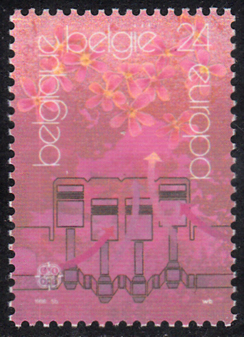 In Belgien erschienen die Europamarken 1988 zum Gemeinschaftsthema "Transport- und Kommunikationsmittel" am 7. Mai 1988. Hier die Marke zu 24 Franc mit der Abbildung eines umweltfreundlichen Motors, die in einer Auflage von 2 100 000 Stück erschien.