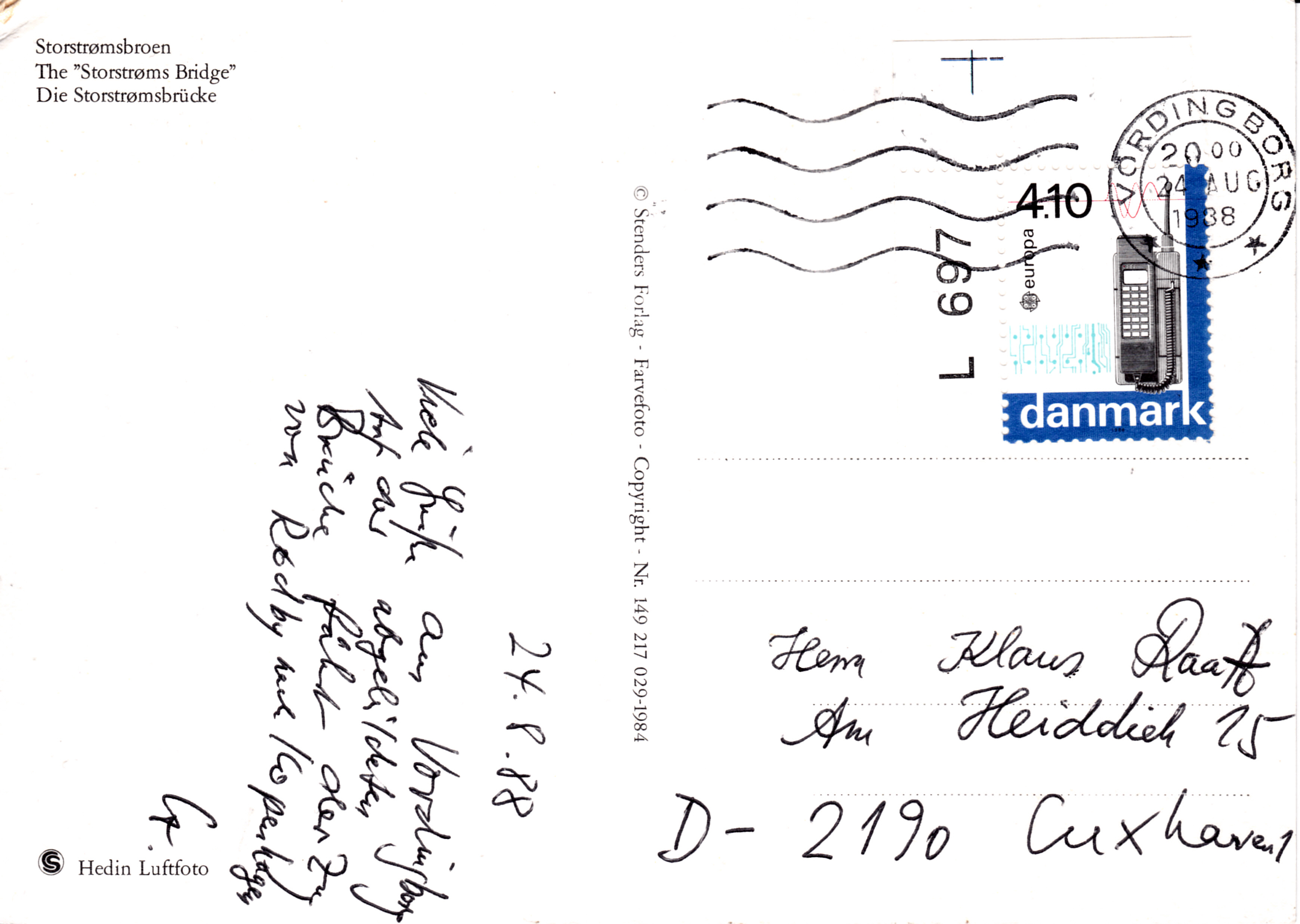 Diese Karte nach Cuxhaven wurde mit dieser Europamarke 1988 zu 4,10Kr vom linken oberen Bogenrand frankiert.