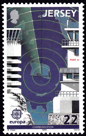In Großbritannien-Jersey erschienen die Europamarken 1988 zum Gemeinschaftsthema "Transport- und Kommunikationsmittel" am 26. April 1988. Hier eine Marke zu 22 Pence mit der Radarstation und der Seefunkstelle in Saint Helier. Die Marke hatte eine Auflage von 510 104 Stück.