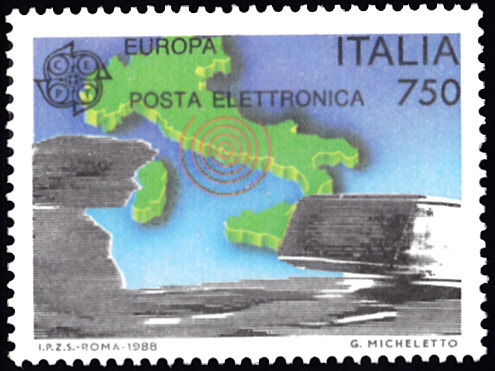 In Italien erschienen die Europamarken 1988 zum Gemeinschaftsthema "Transport- und Kommunikationsmittel" am 2. Mai 1988. Hier die Marke zu 750 Lire mit einer Landkarte Italiens und einer Postbeamtin am Computer. Die Marke erschien in einer Auflage von 4 000 000 Stück.