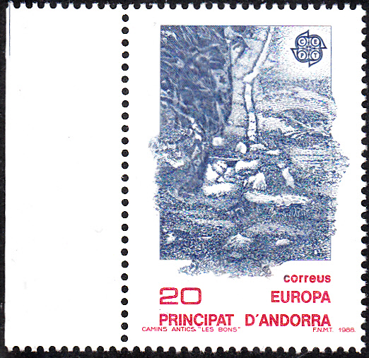 Bei der spanischen Post in Andorra erschienen die Europamarken 1988 zum Gemeinschaftsthema "Transport- und Kommunikationsmittel" am 5. Mai 1988 in einer Auflage von 600 000 Stück. Die Marke zu 20 Pesetas dunkelblau/karminrot zeigt di8e antike Straße nach Les Bons.