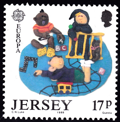 In Großbritannien-Jersey erschienen die Europamarken 1989 zum Gemeinschaftsthema "Kinderspiele" am 25. April 1989 mit Figurengruppen aus Knetmasse von Clare Luke (14 J.). Hier einer Marke zu 17 Pence mit spielenden Kleinkinder. Die Auflage der Marke betrug 473 930 Stück.