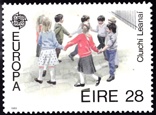 In Irland erschienen die Europamarken 1989 zum Gemeinschaftsthema "Kinderspiele" am 11. Mai 1989. Hier die Marke zu 28 Pence mit einer Darstellung zum Kinderspiel "Ringelreihen". Die Auflage der Marke betrug 1 000 000 Stück.