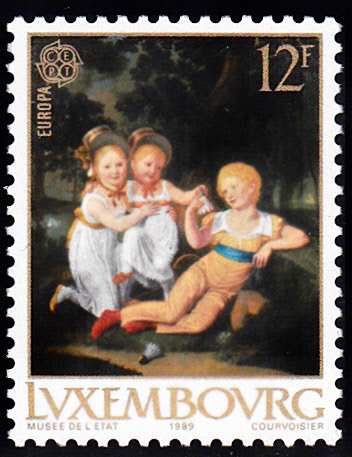 In Luxemburg erschienen die Europamarken 1989 zum Gemeinschaftsthema " Kinderspiele" am 8. März 1989. Hier die Marke zu 12 Franc mit der Abbildung "Drei Kinder im Park" nach einem Gemälde eines unbekannten Meisters (19. Jh.). Die Auflage betrug 700 000 Stück.