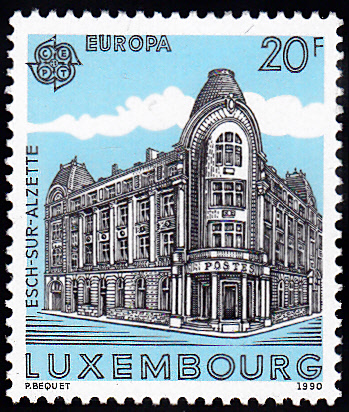 Die Europamarken 1990 sind in Luxemburg zum Gemeinschaftsthema "Postalische Einrichtungen" am 28. Mai 1990 erschienen. Hier die Marke zu 12 Franc mit der Abbildung des Postamtes in Esch-sur-Alzette. Die Auflage der Marke betrug 800 000 Stück.
