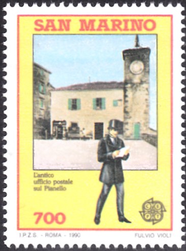 Die Europamarken 1990 sind in San Marino zum Gemeinschaftsthema "Postalische Einrichtungen" am 22. Februar 1990 erschienen. Hier die Marke zu 700 Lire mit der Abbildung des Postamtes in Pianello im Jahre 1842. Die Auflage der Marke betrug 375 000 Stück.