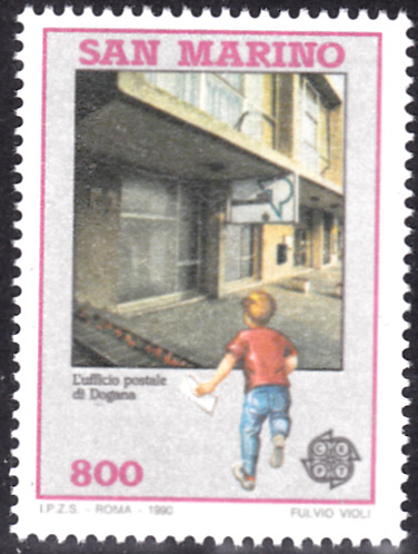 Die Europamarken 1990 sind in San Marino zum Gemeinschaftsthema "Postalische Einrichtungen" am 22. Februar 1990 erschienen. Hier die Marke zu 800 Lire mit der Abbildung des Postamtes in Dogana. Die Auflage der Marke betrug 375 000 Stück.